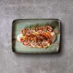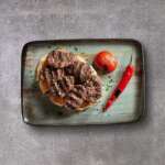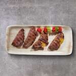 Zırhlanmış et ve özel ORA baharatları. Közlenmiş biber, közlenmiş domates, sumaklı soğan ve lavaş ile servis edilir.