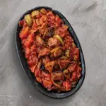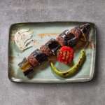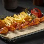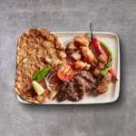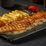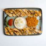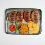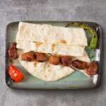 Marine edilmiş kemiksiz tavuk but. Közlenmiş biber, közlenmiş domates, lavaş ve patates ile servis edilir.