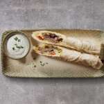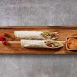 Lavaş, Tavuk Şiş, kibrit patates, marul, kırmızı biber, özel ORA sosu ve humus