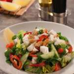 Akdeniz yeşillikleri, domates, salatalık, kırmızı biber, roka, ceviz, beyaz peynir, zeytinyağı, nar ekşisi