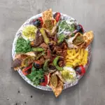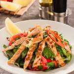 Izgara tavuk, Akdeniz yeşillikleri, domates, salatalık, kırmızı biber, roka, zeytinyağı, nar ekşisi