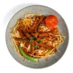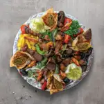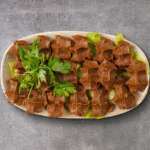 Özel sosunda dinlendirilmiş kuşbaşı et, kaşar peyniri, mevsim yeşillikleri ile