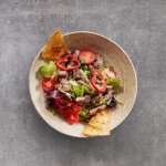 Köfte, Akdeniz yeşillikleri, domates, salatalık, kırmızı biber, roka, zeytinyağı, nar ekşisi