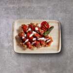 Tereyağlı pide, Manisa köfte, kibrit patates, yoğurt ve özel ORA domates sosu. Közlenmiş biber ve közlenmiş domates ile servis edilir.
