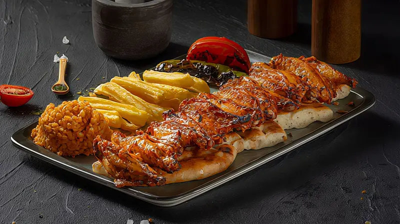 Marine edilmiş yaprak tavuk kanat. Közlenmiş biber, közlenmiş domates ve lavaş ile servis edilir.