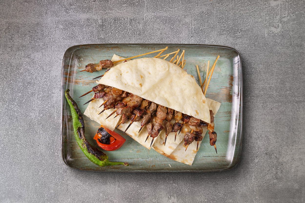 Marine edilmiş kuzu eti ve özel ORA baharatları. Közlenmiş biber, közlenmiş domates, sumaklı soğan ve lavaş ile servis edilir.