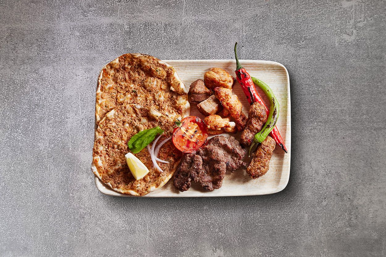 Adana kebap, Urfa kebap, Kuzu Şiş, Tavuk Şiş, Fındık Lahmacun ve Ora Köfte. Közlenmiş biber, közlenmiş domates, sumaklı soğan ve lavaş ile servis edilir.