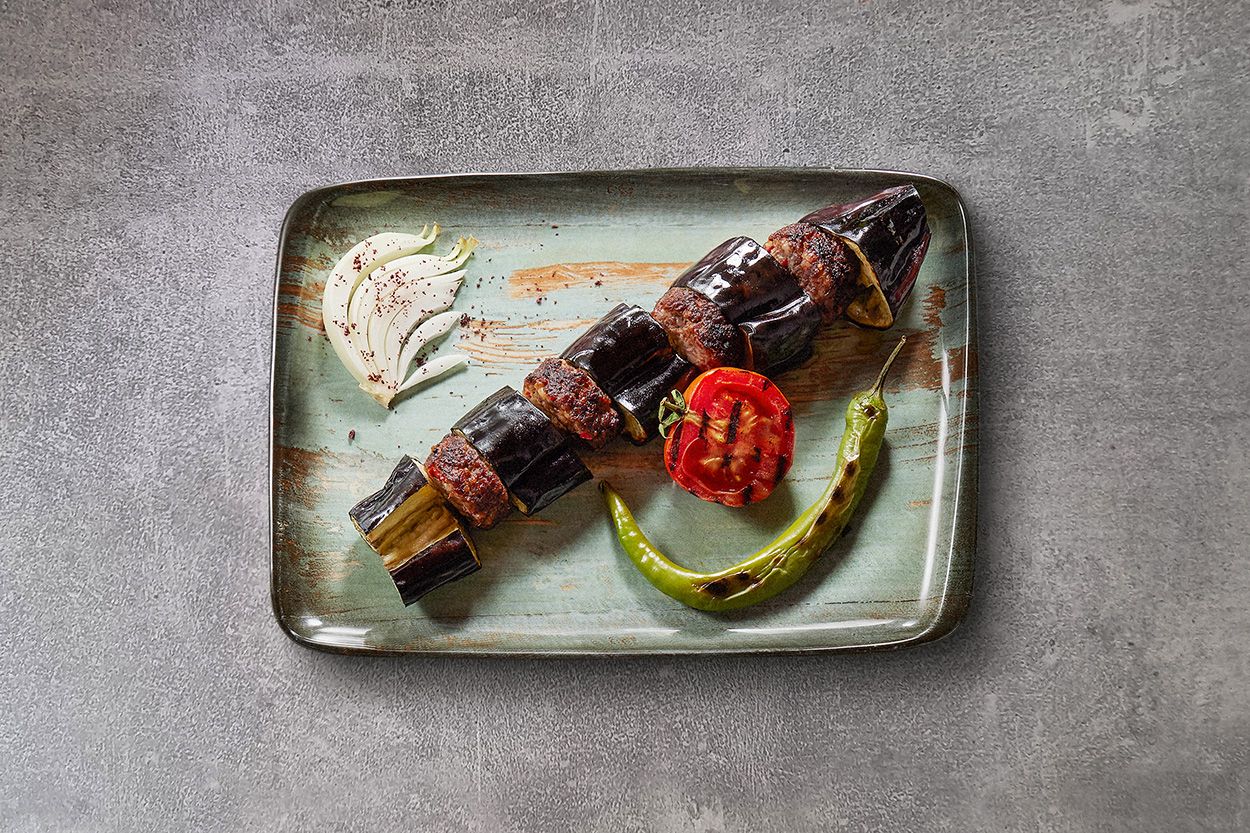 Zırhlanmış et ve özel ORA baharatları. Közlenmiş biber, közlenmiş domates, sumaklı soğan ve lavaş ile servis edilir.