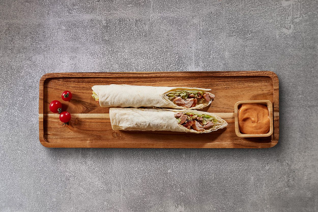 Lavaş, Tavuk Şiş, kibrit patates, marul, kırmızı biber, özel ORA sosu ve humus